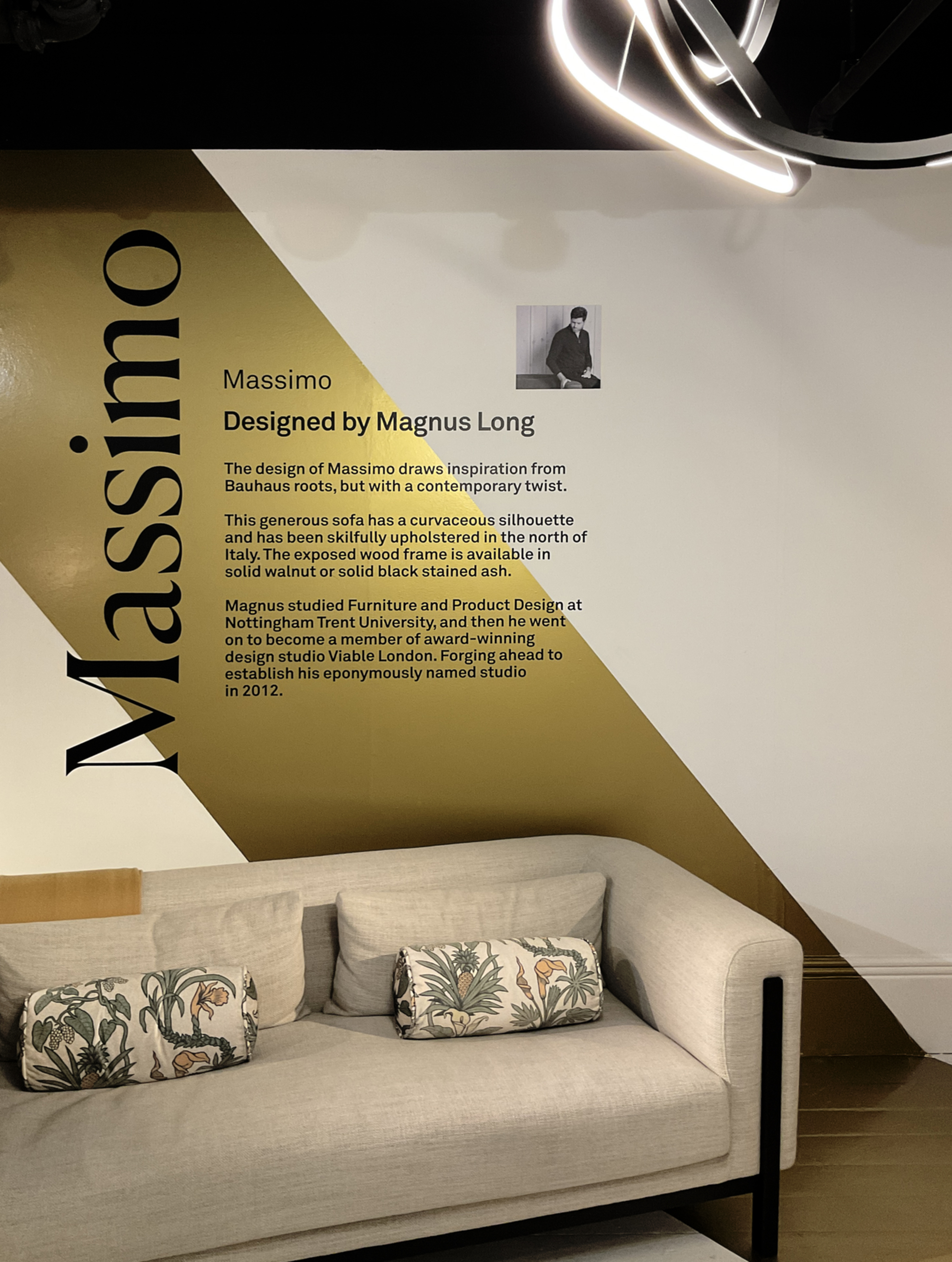 The space was basically a white box, so I wanted to unite the collections through an gold diagonal form that embelished luxury and modernism in a single expressive stroke cutting across the room.
